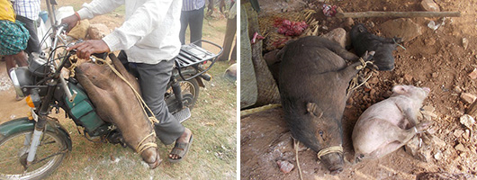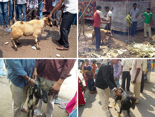 Recently on the occasion of Maha Shiv Ratri on 28-02-2014, hundreds of animals were brought for sacrifices at the Durgalamma Temple; which was countered by our team on the spot and we managed to save some of them. But on being told not to sacrifice, devotees take them to other safe place for sacrificing. Such is the ignorance and superstition in the mind of devotees; they consider sacrificing the utmost good to the God.